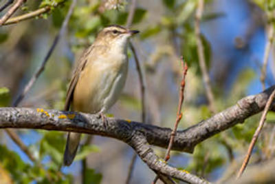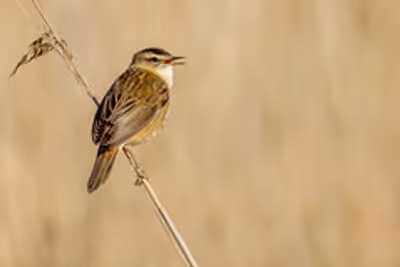 A sedge warbler (Acrocephalus schoenobaenus) on a reed.